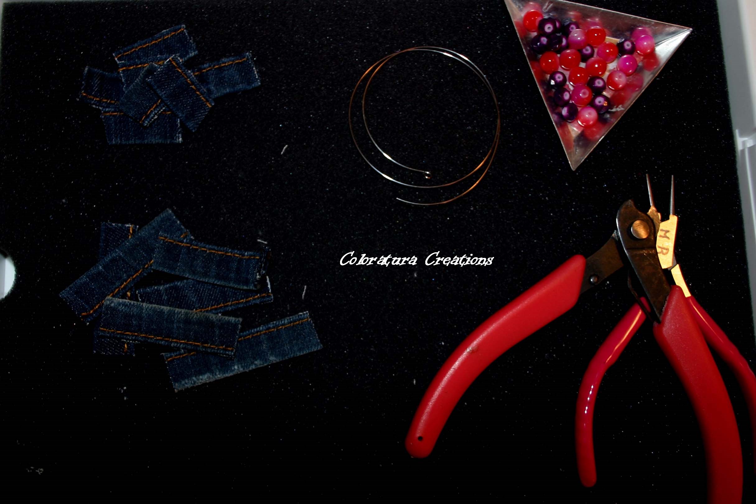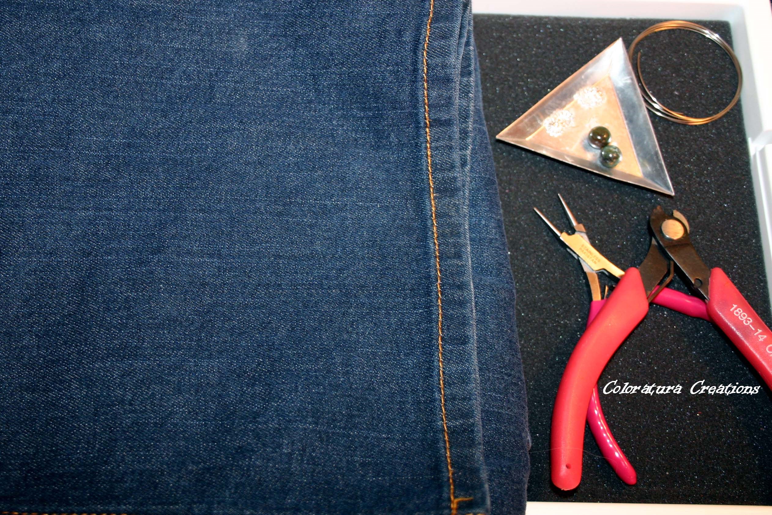 Here’s what you’ll need: An old pair of jeans with hems in tact (if you have a pair with damaged hems like I do, short girl problems, I’ll show you a project with those next), Memory Wire, Large Round Beads, Round Nose Pliers, Memory Wire Cutters, and Fabric Scissors. That’s it!