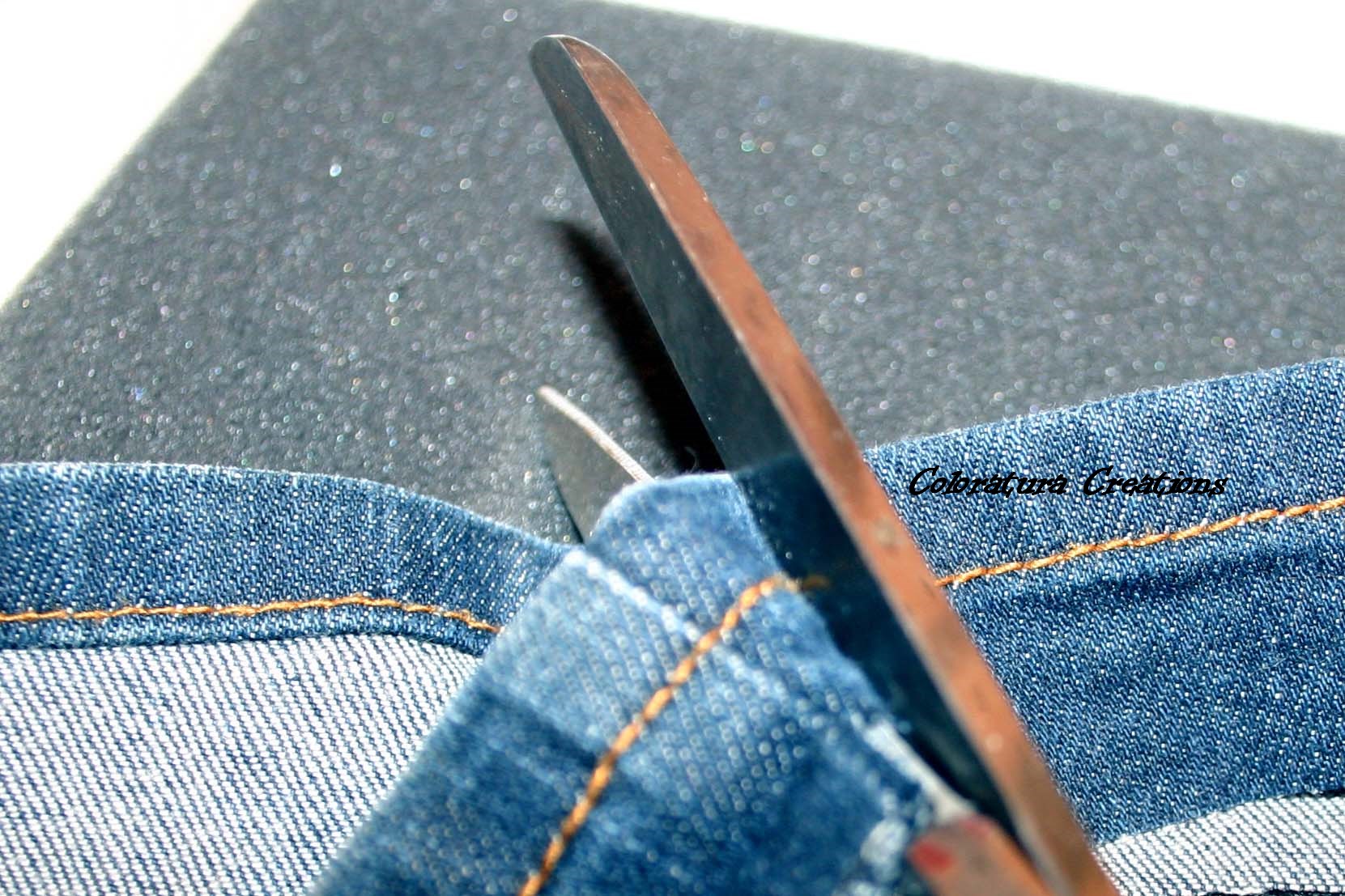 Snip off the inside seam on both sides (not the double stitched outer seam).