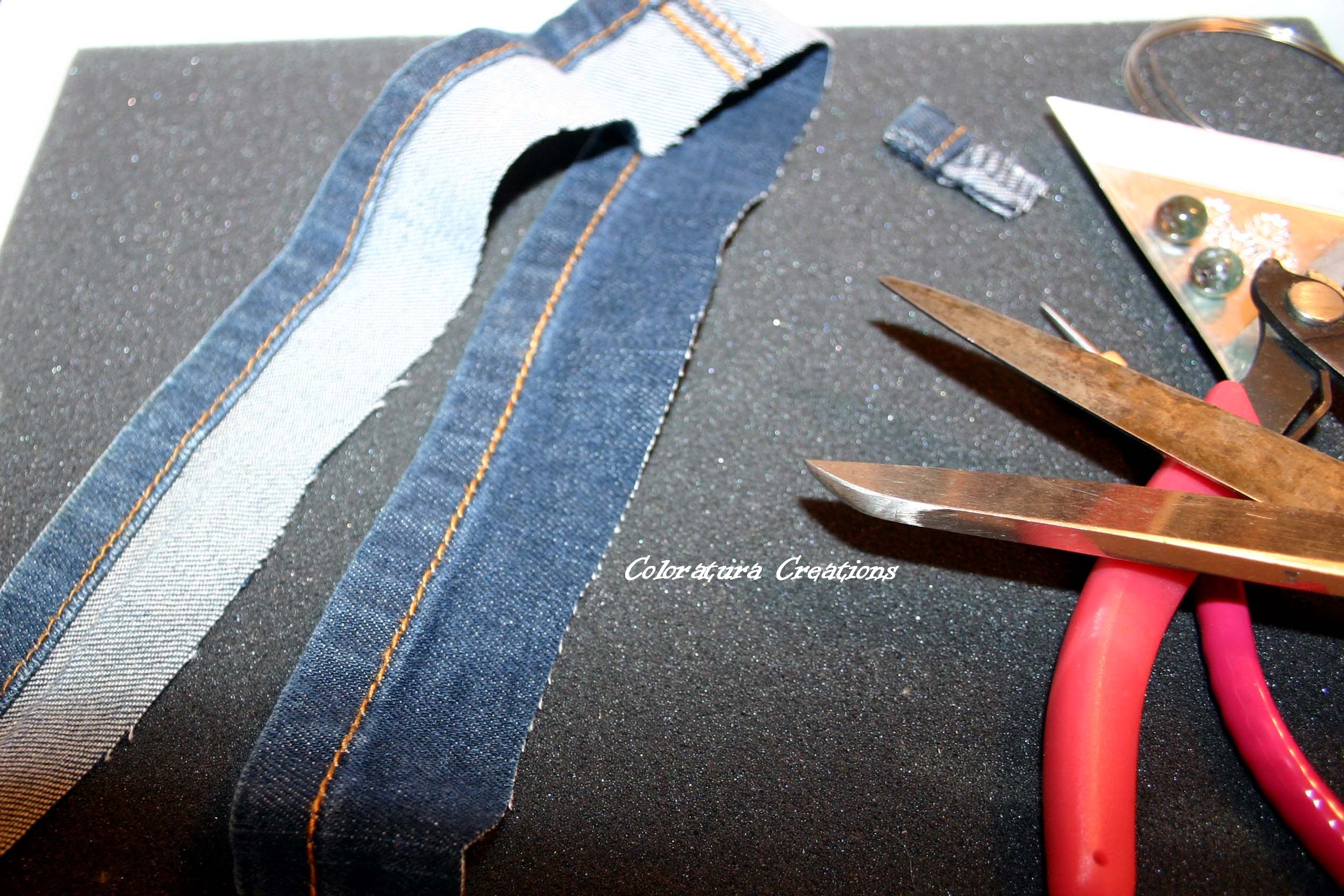 We’re going to prepare the jean’s hems in the same way as above, but then we will cut the hem into shorter lengths to make denim “beads.” I cut an equal number of 1″ and 2″ lengths for variety.