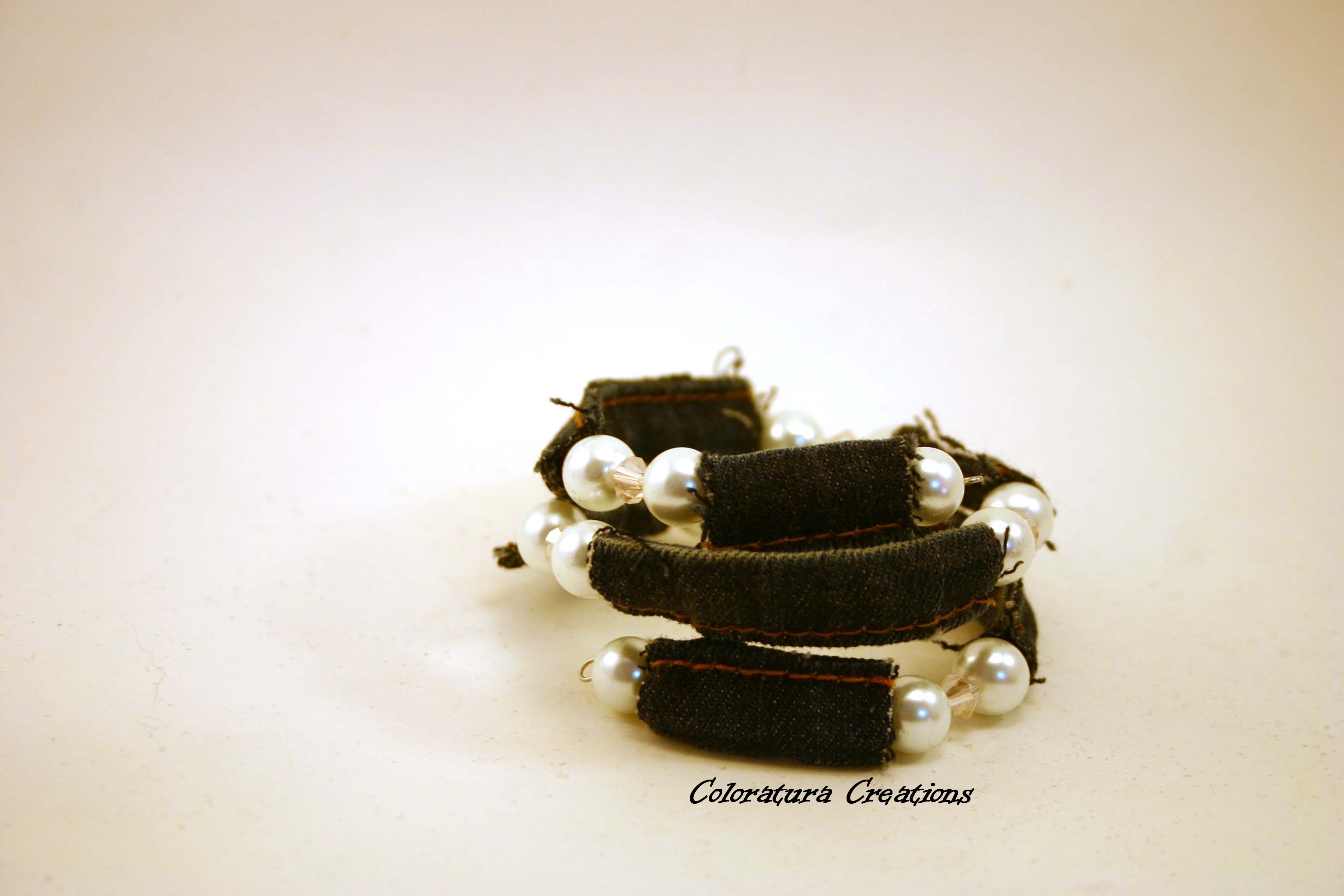 Depending on the length you chose, you probably have some denim “beads” left, so make another bracelet! I just love the contrast of the pearls and crystals with the denim, this bracelet is my favorite!