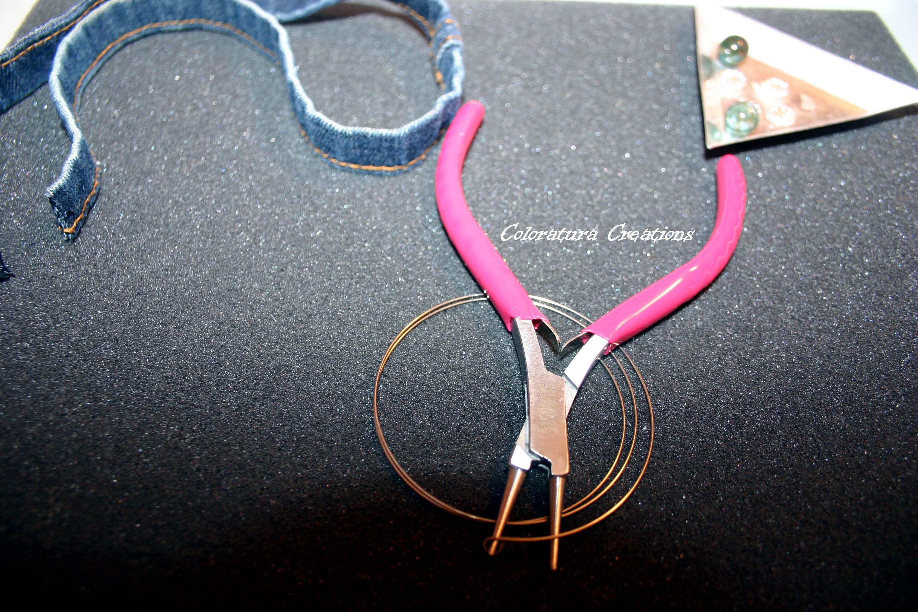 Make a loop in one end of the memory wire. You’ll cut this off later, but it’s much easier to feed a smooth edge through the denim (trust me, I tried!). To loop memory wire, use round nose pliers to curve the wire in the opposite direction of the spirals.